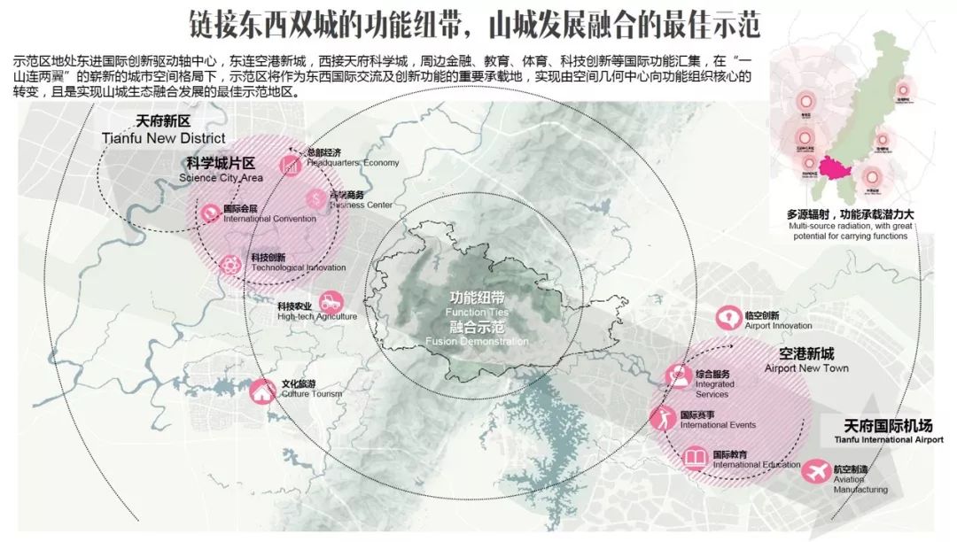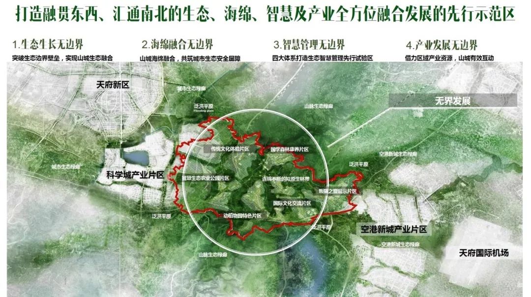 這是成都天府新區(qū)和空港新城之間的山體區(qū)域,是成都“一山”連“兩翼”山、城、人互動(dòng)融合的最佳示范區(qū),規(guī)劃將以生態(tài)、海綿、智慧、產(chǎn)業(yè)四大戰(zhàn)略落位為基礎(chǔ),在大森林體系中植入六大特色產(chǎn)業(yè)片區(qū),示范”無界發(fā)展“的城市新理念。